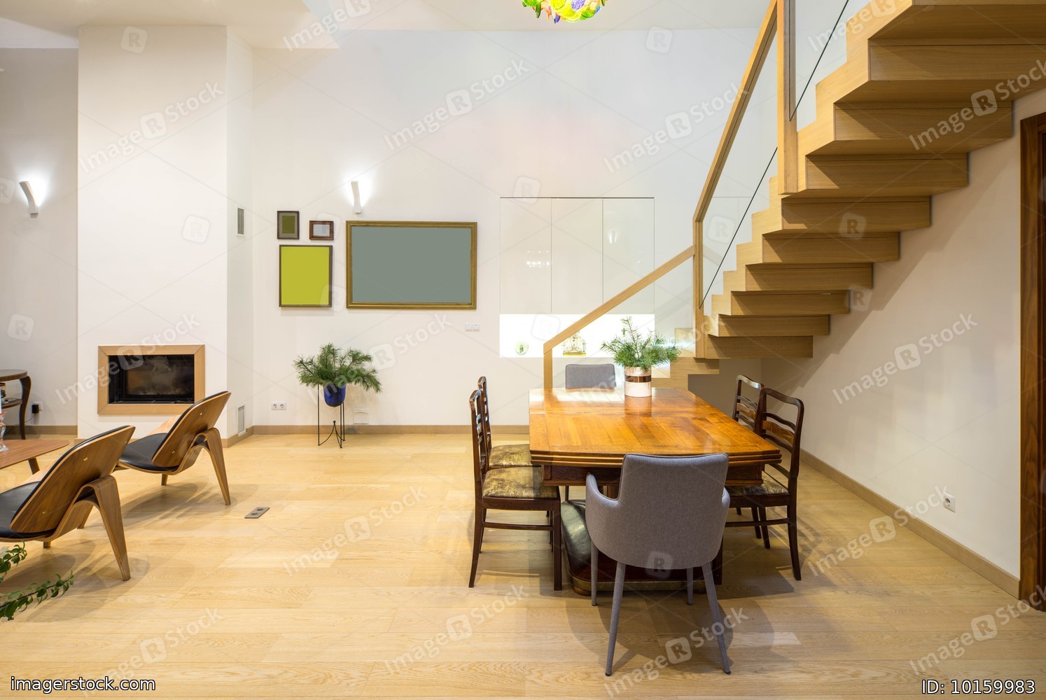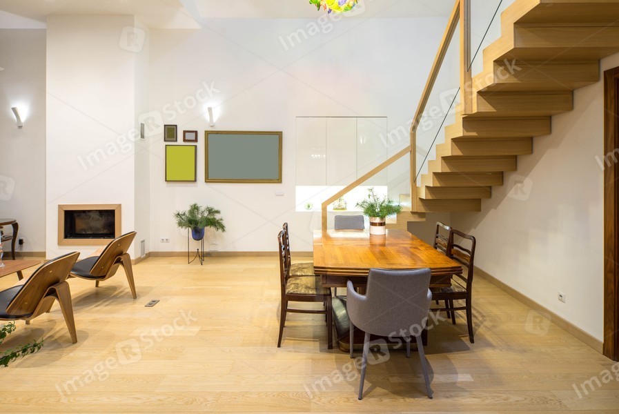 Light interior of room in private house. Wooden staircase, table and chairs. Chandelier. Black fireplace.