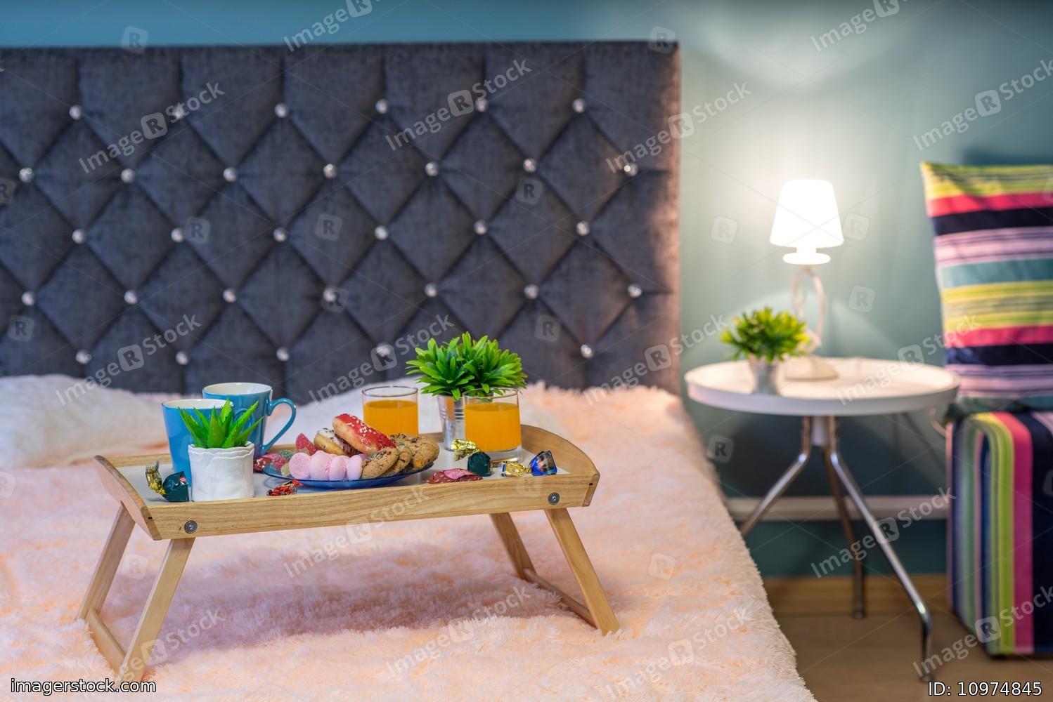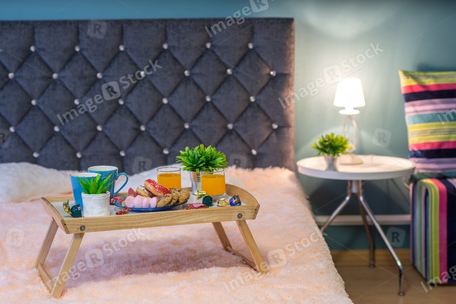 Close-up of tray with food. Romantic breakfast composition.
