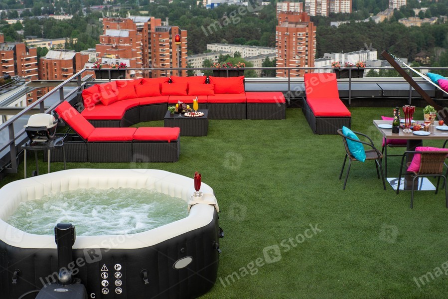 Relaxing zone on the rooftop with furniture and jacuzzi. Veiw of city from the top.