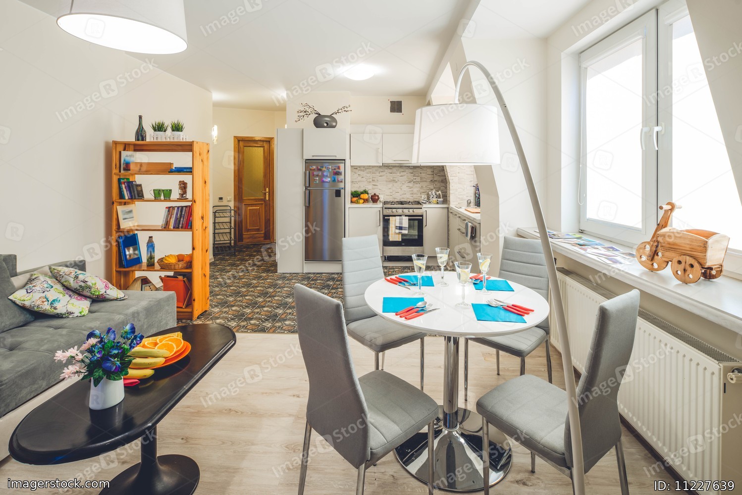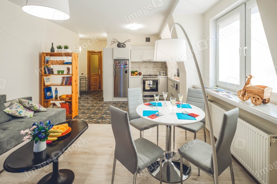 Spacious studio apartment with furniture. Living room. Kitchen. Light interior.