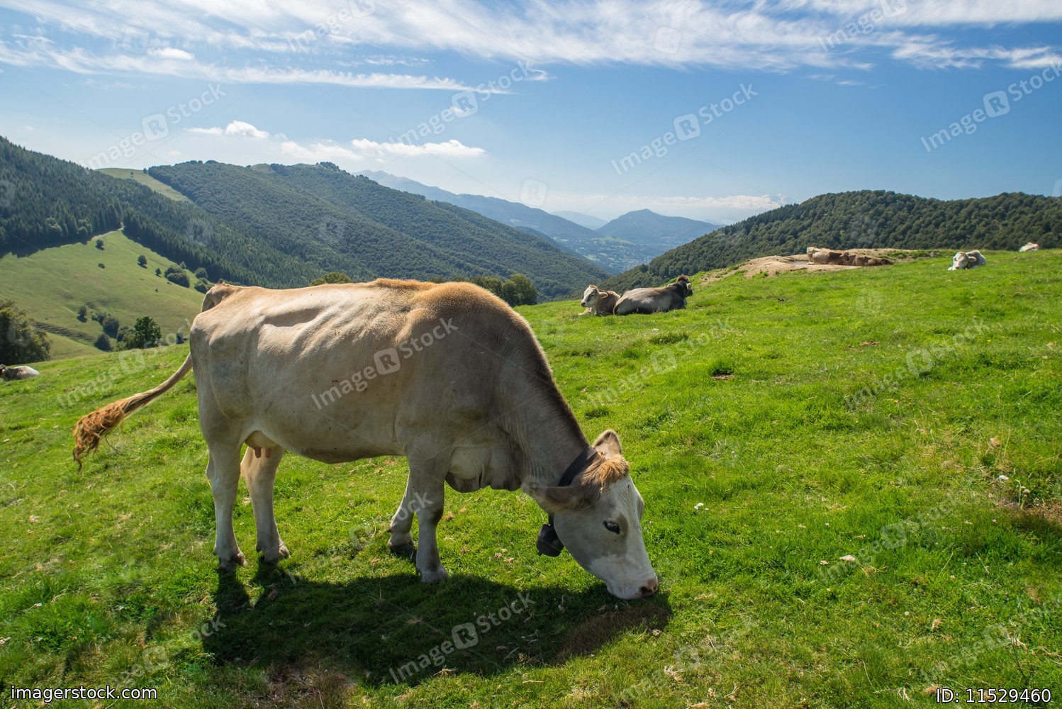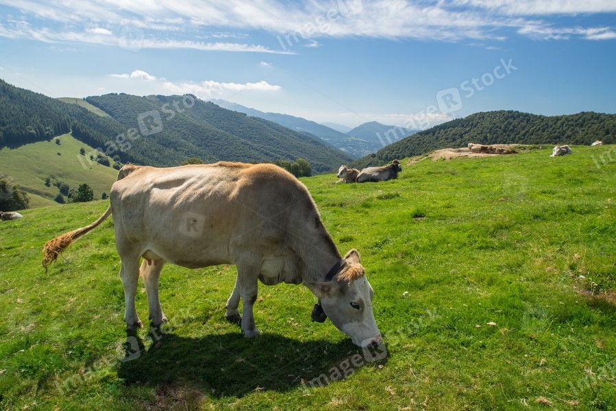 The pasture in the mountains. Cows grazing on the hills. Italy.