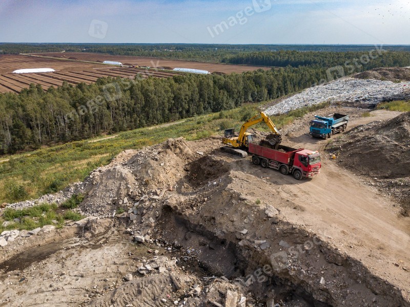 Heavy excavator in action. Trucks on dirt road. Construction works near forest and field. Top view.