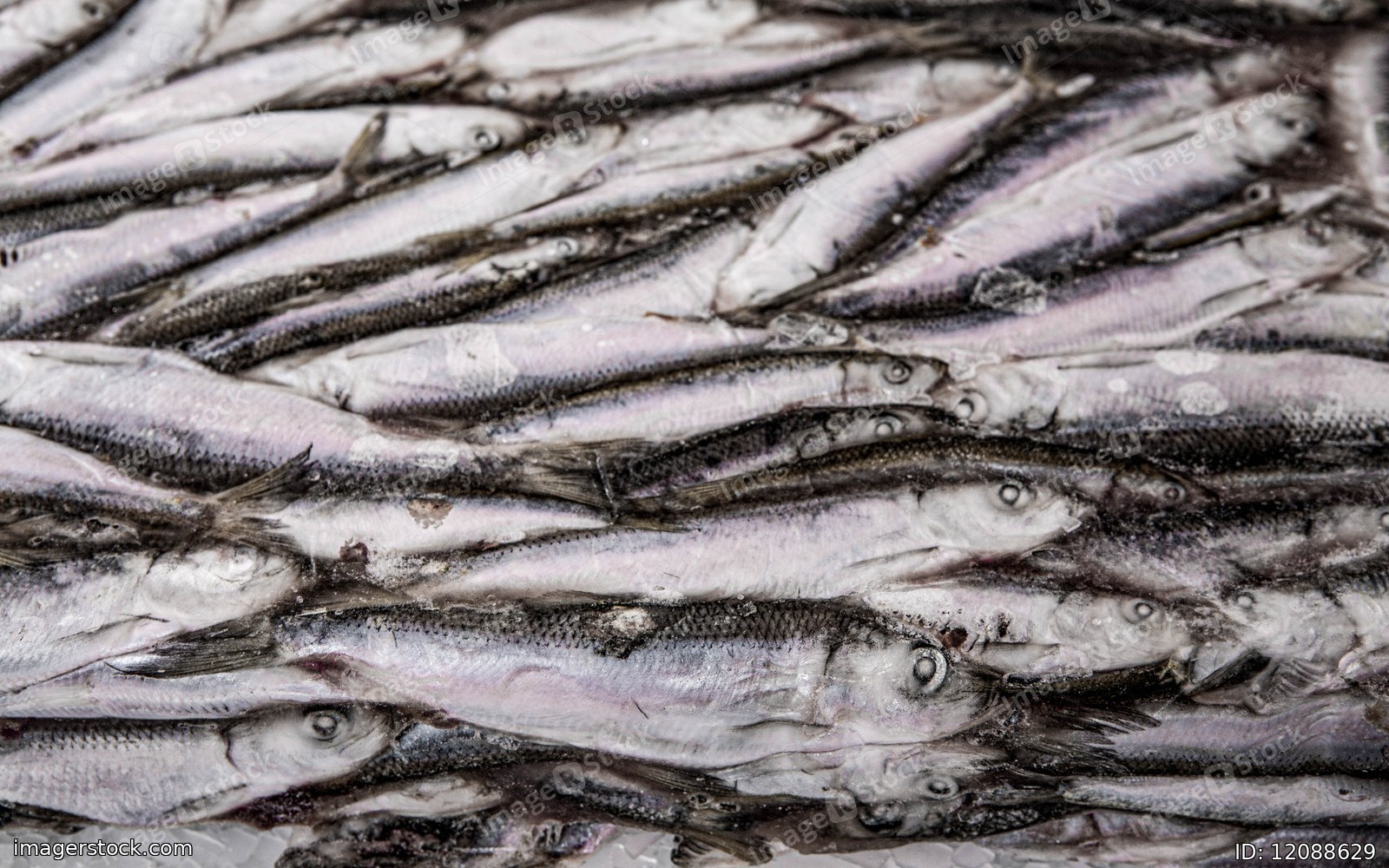 Close-up of frozen sprat in fish market. Winter fishing. Small silver fish.