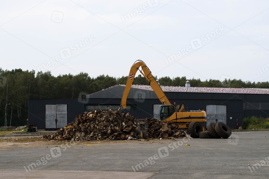 Excavator works at dump of old rusty scrap metal. A lot of garbage and tires on asphalt near warehouse.
