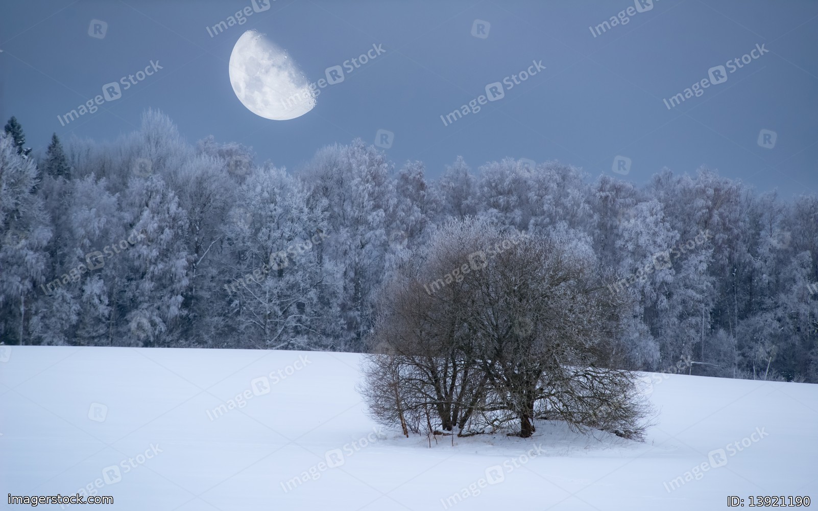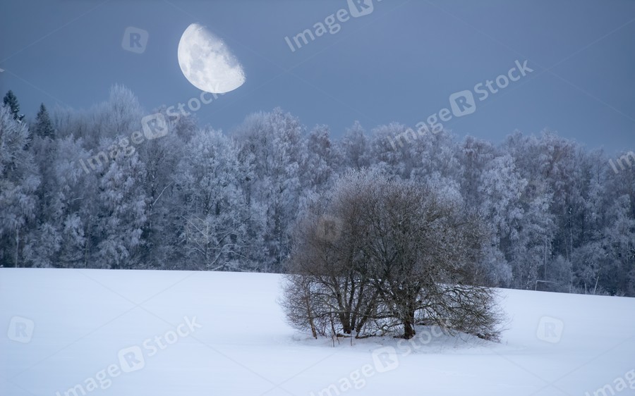 Beautiful winter landscape. Snowy forest. Moon in sky.