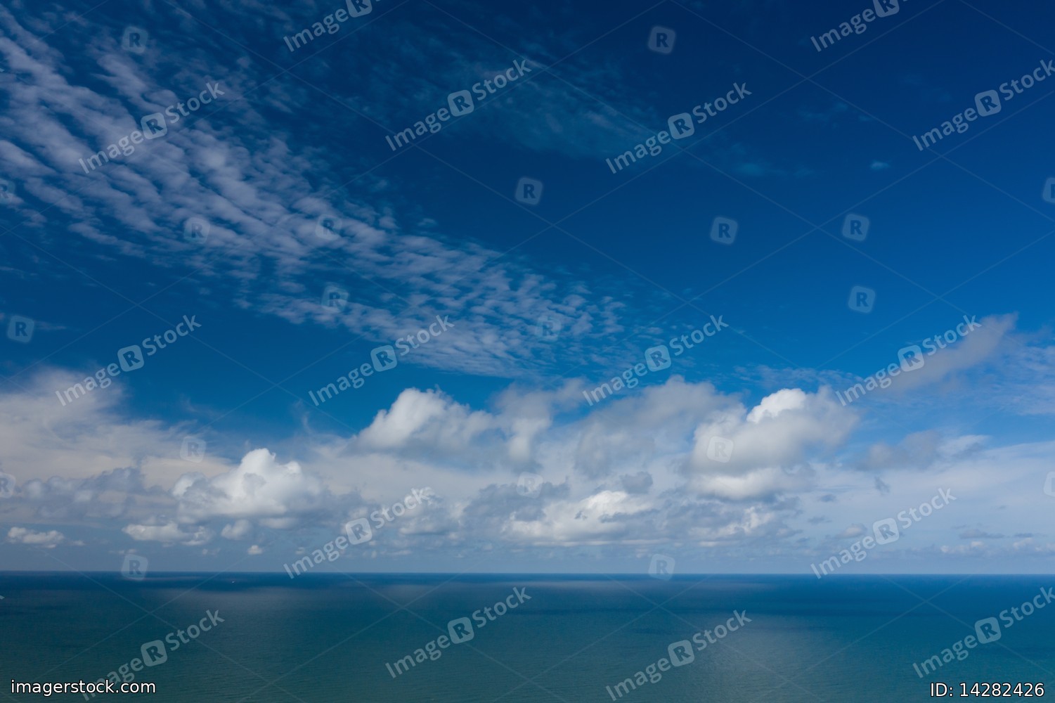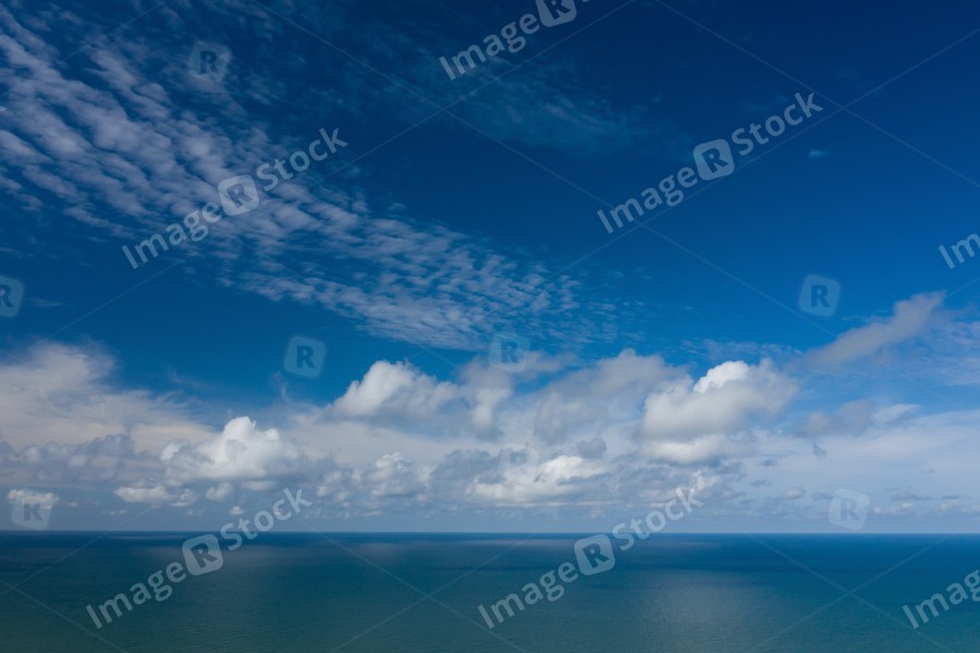 Peaceful sea and cloudy blue sky. Horizon line.