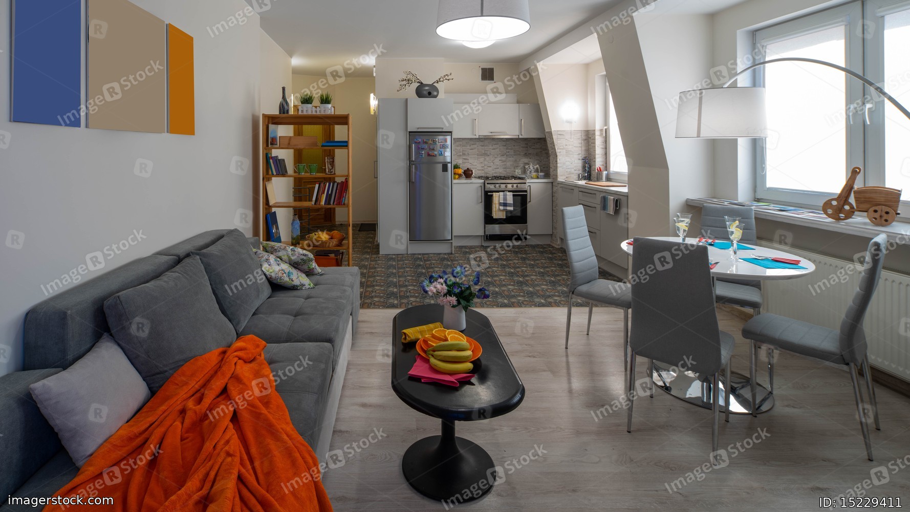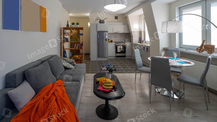 Spacious studio apartment with furniture. Living room. Kitchen. Light interior.