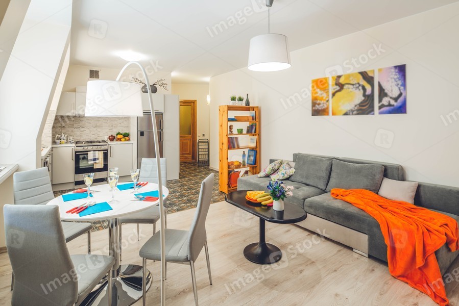 Spacious studio apartment with furniture. Living room. Kitchen. Light interior.