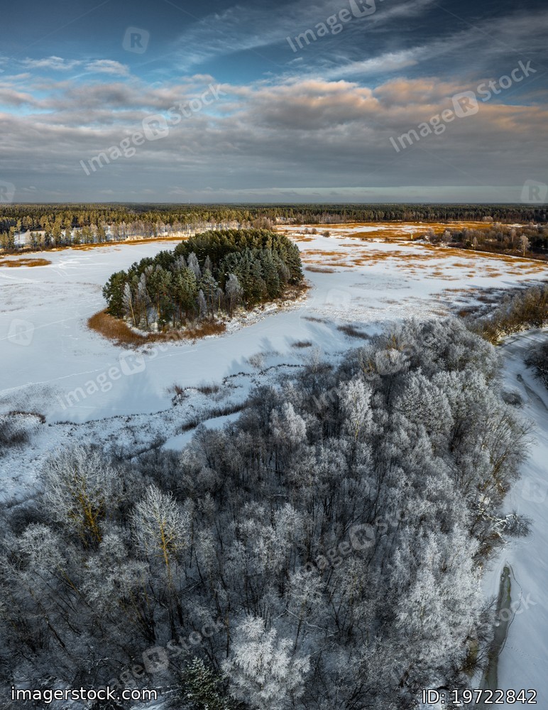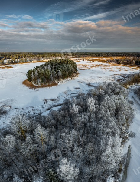 Beautiful winter nature. Scenic landscape. Top drone view of forest.