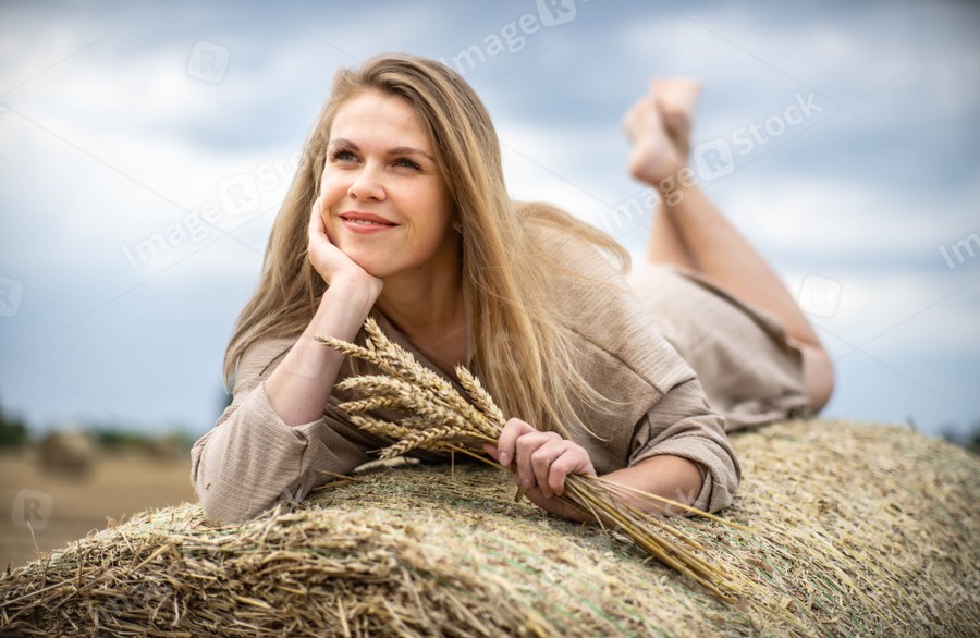 Beautiful happy woman lying on a haystack.