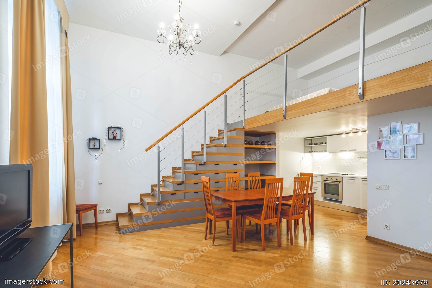 Interior in warm tones. Private house. Staircase to the second floor. Kitchen set.