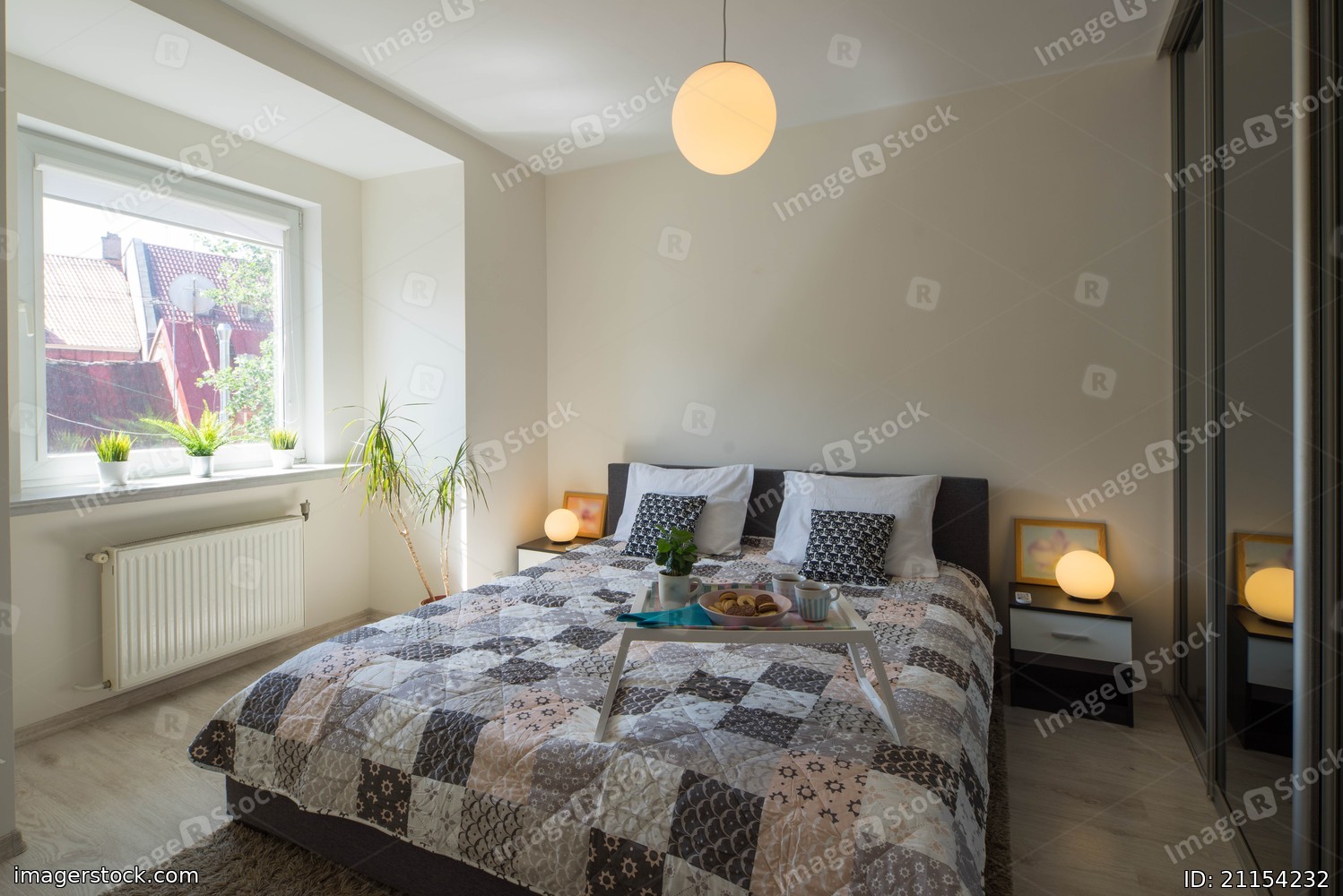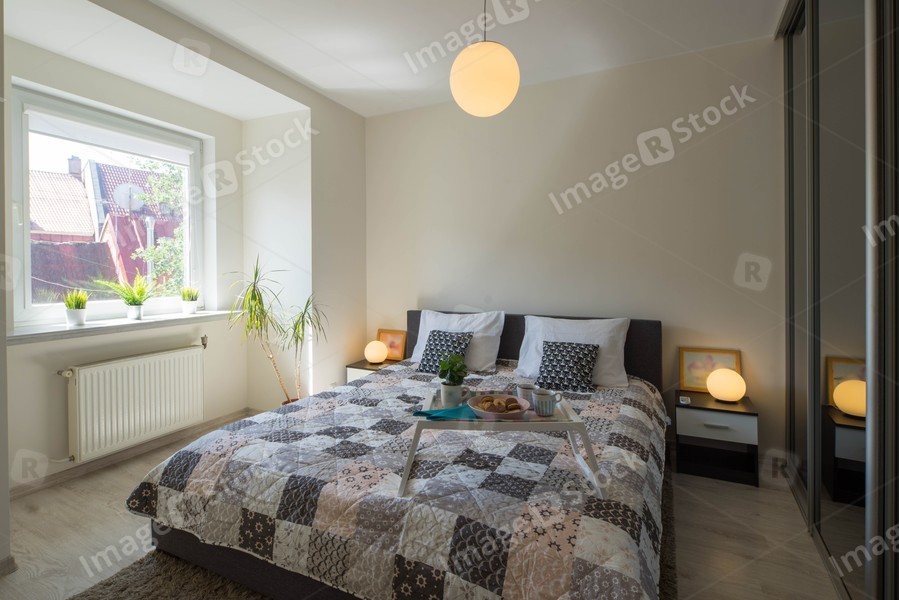 Modern interior of bedroom. Tray with food on the bed. Bedsides with round lamps. Window.