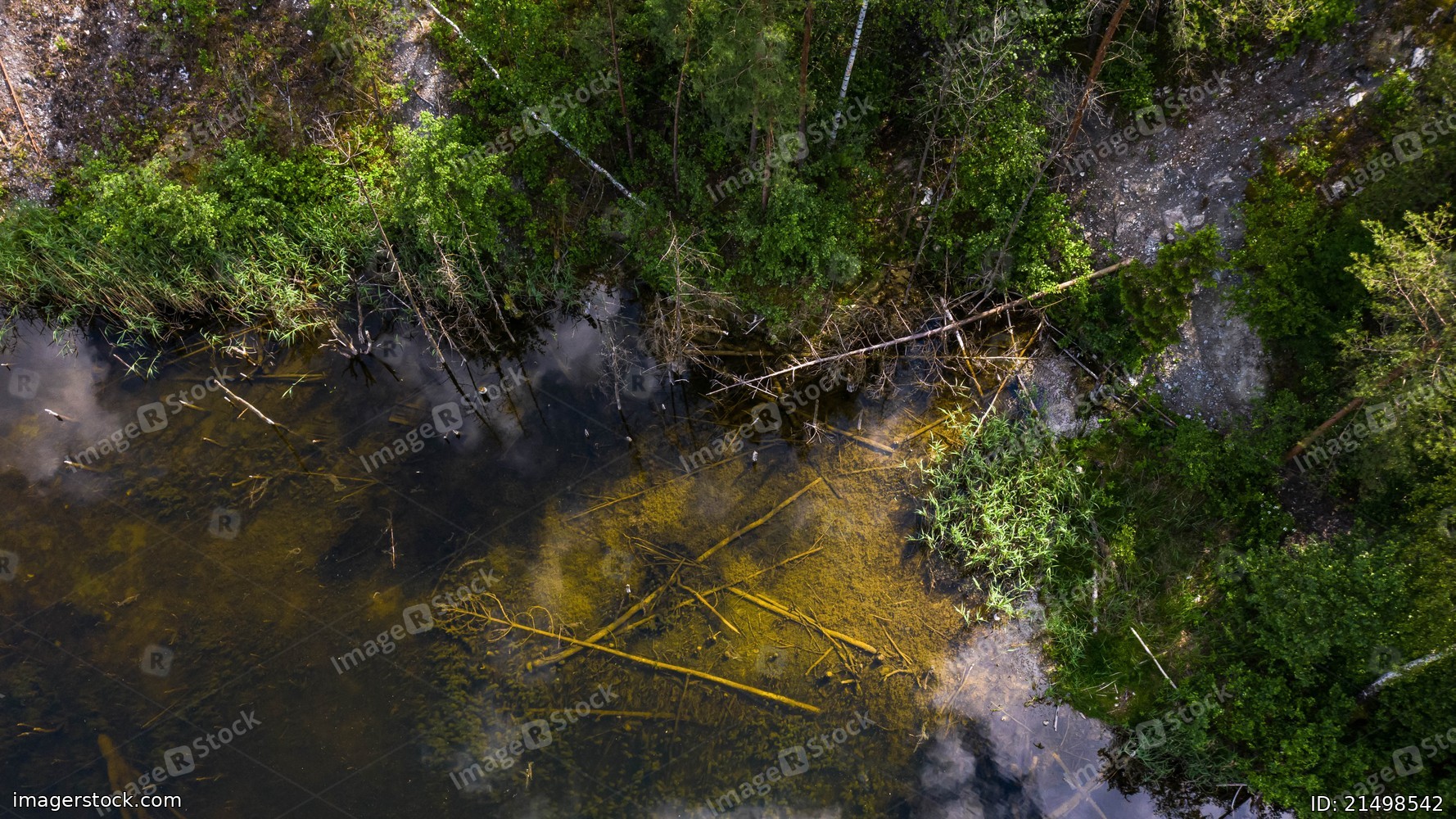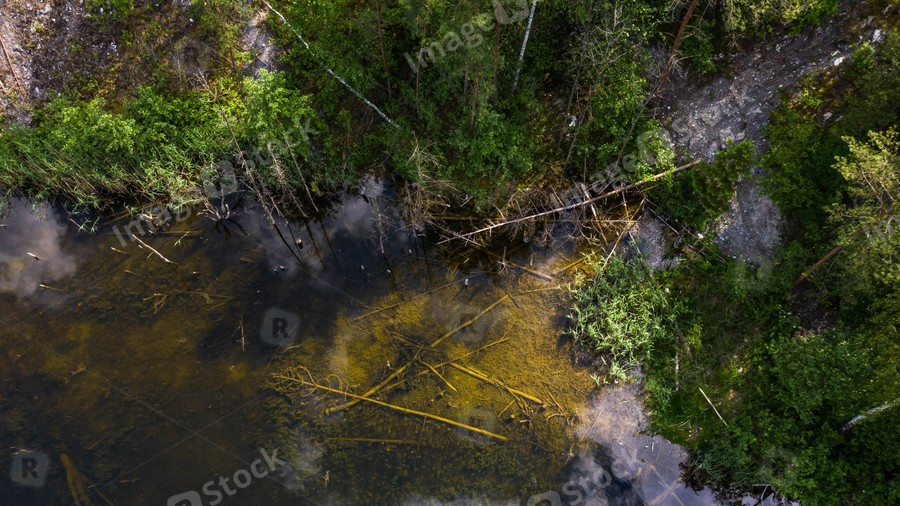 Drone view from above of forest lake. Reflection of cloudy sky. Dry trees in the water.