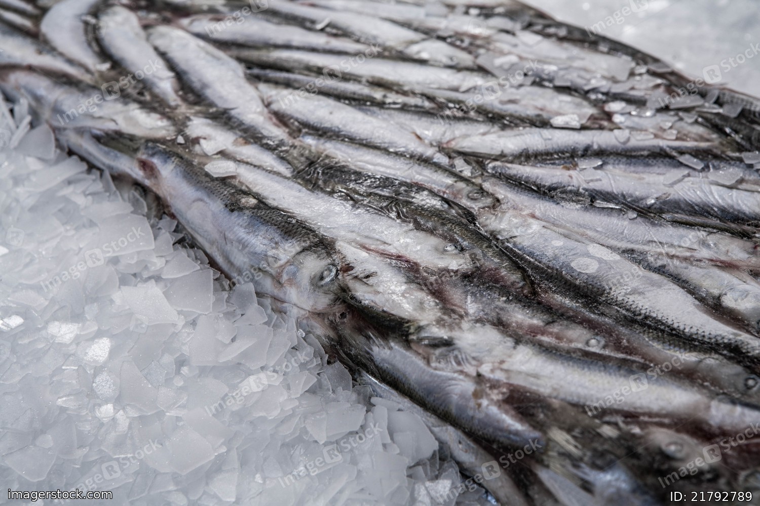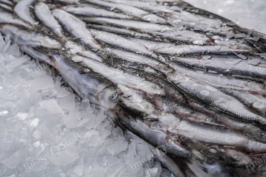 Close-up of sprat brick on the ice in fish market. Winter fishing. Frozen small silver fish.