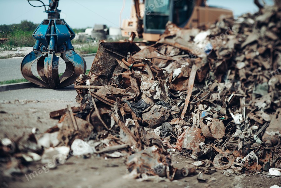 Dump of old rusty scrap ready for recycling. Manual hydraulic manipulator. Equipment garbage collection. Close-up.