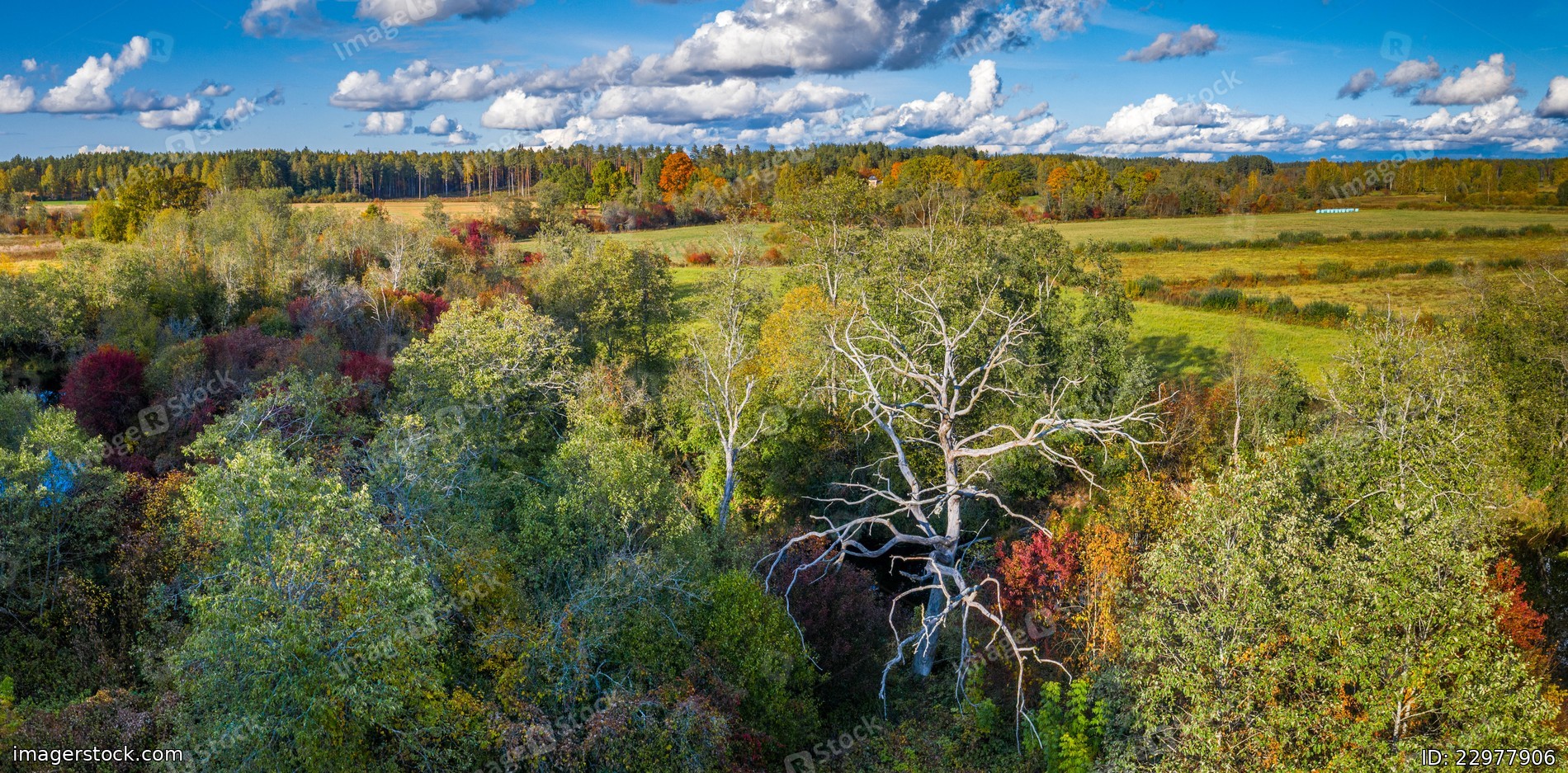 Latvian autumn nature. Forest and cloudy sky. View from the top.