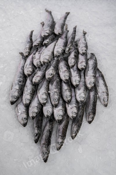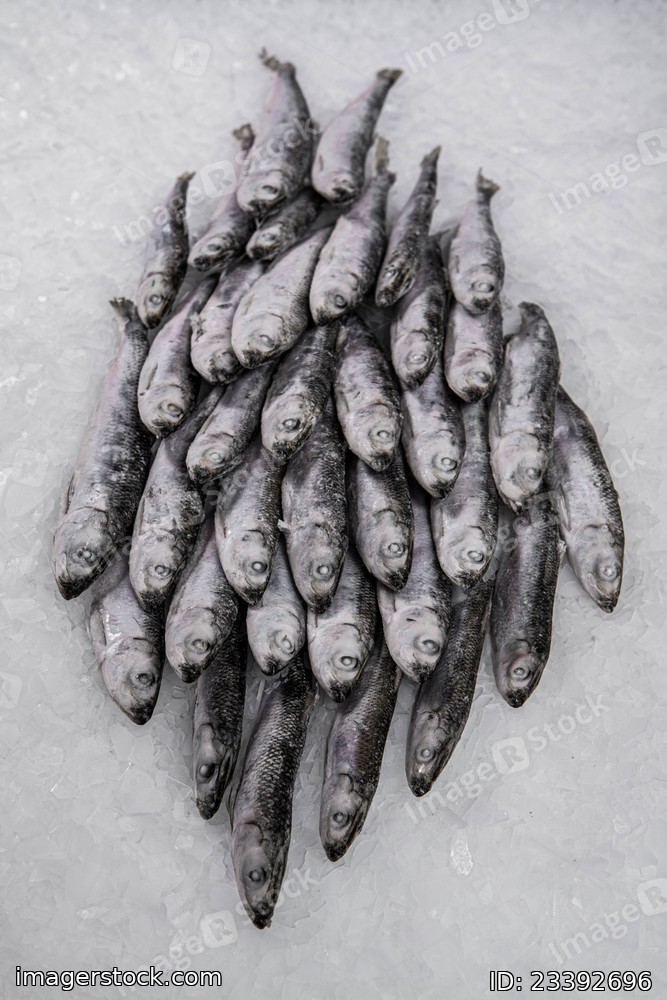 Close-up of fresh sprat on the ice in fish market. Winter fishing. Small silver fish.