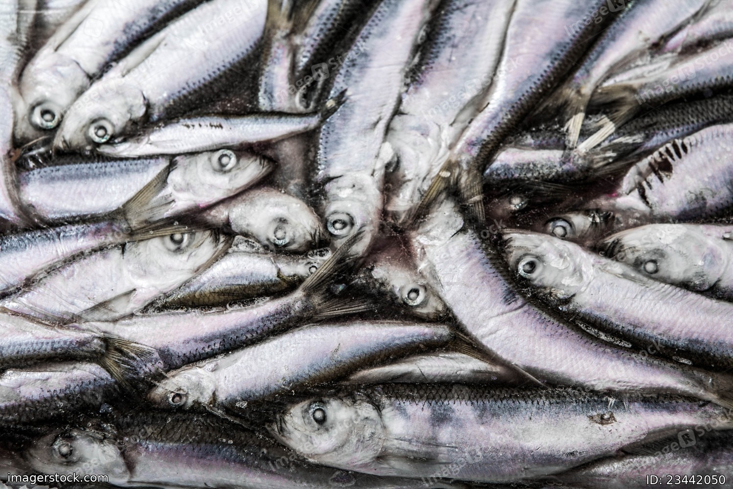 Close-up of frozen sprat in fish market. Winter fishing. Small silver fish production.