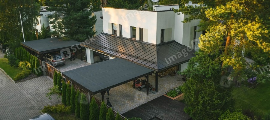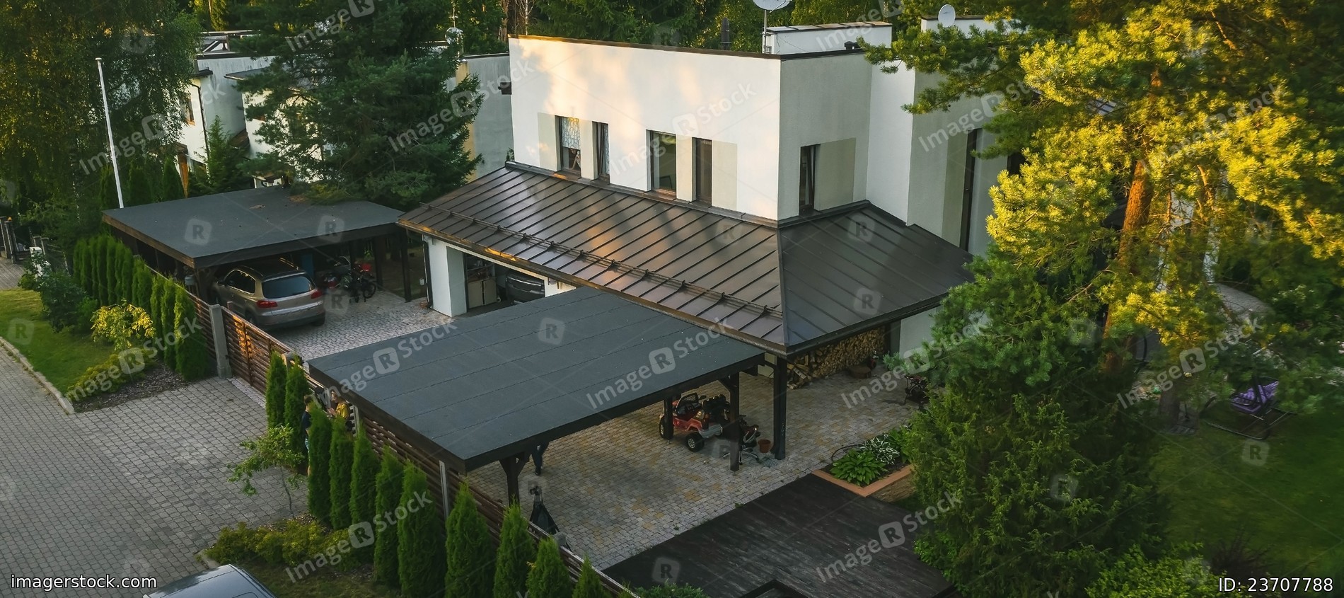 Top view of luxury cottage. Modern architecture of private house. Green trees. Car in garage.