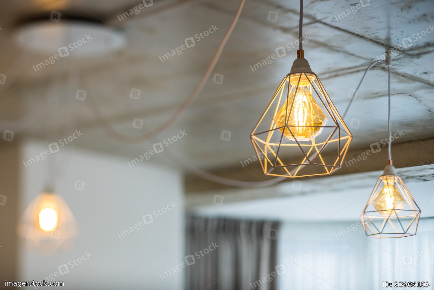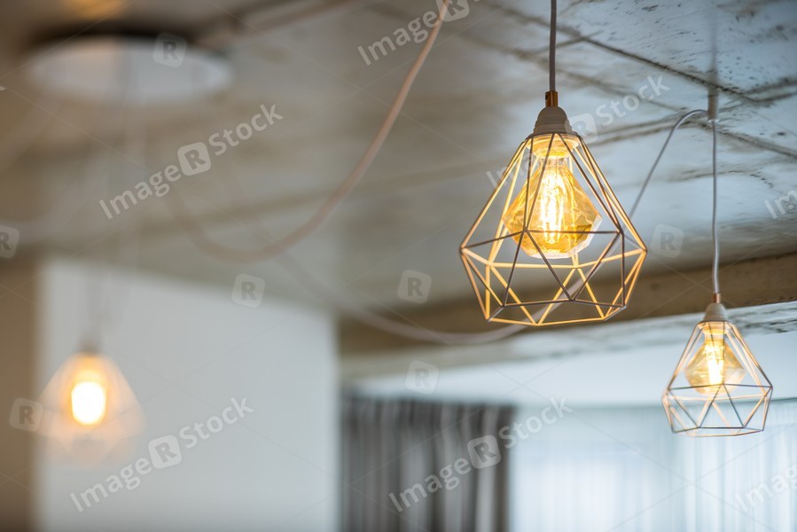Interior of a modern apartment. Concrete ceiling and stylish lamp.