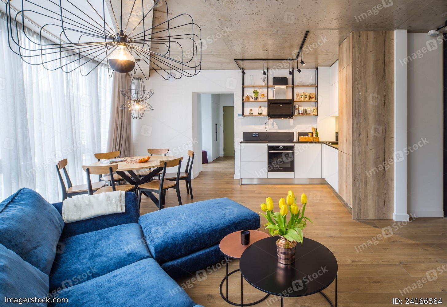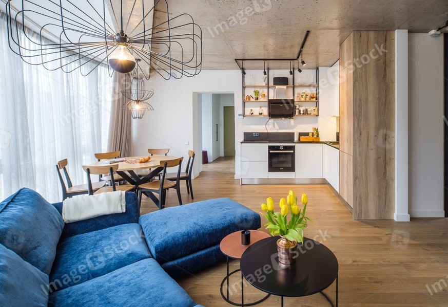 Interior living room bathroom with a sofa in the studio apartment. Concrete ceiling. Loft.