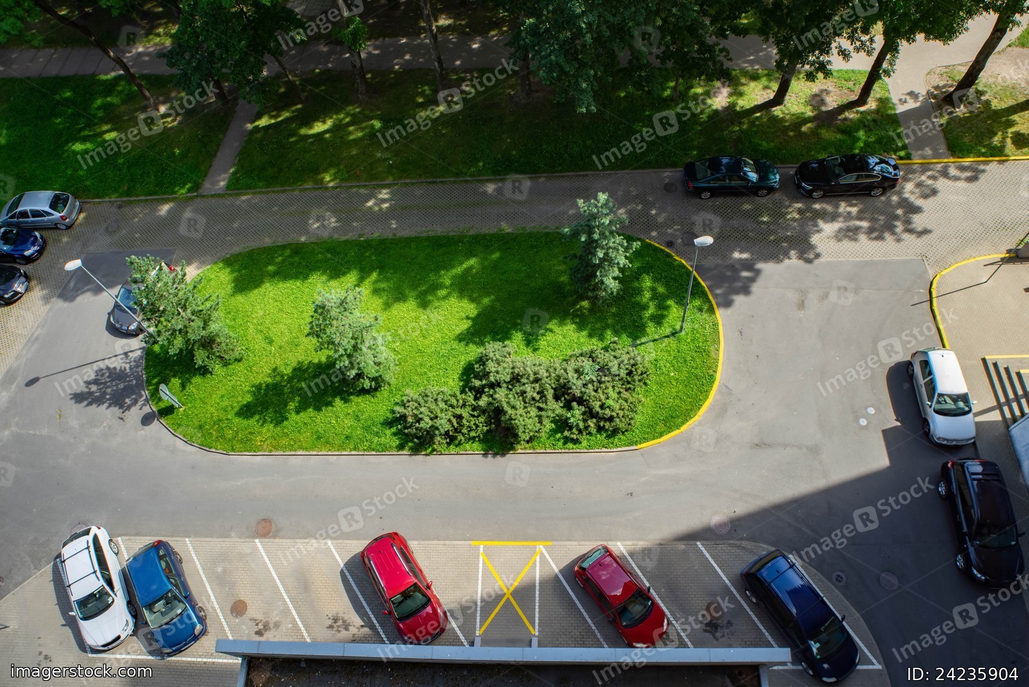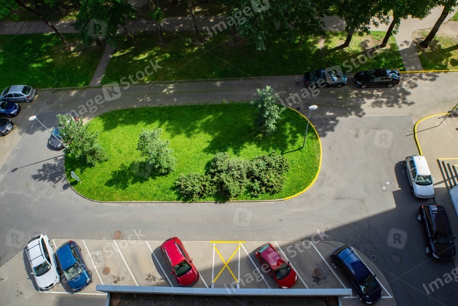 Cars parking near residential building. Top view. Green grass and trees. Sunny summer day.