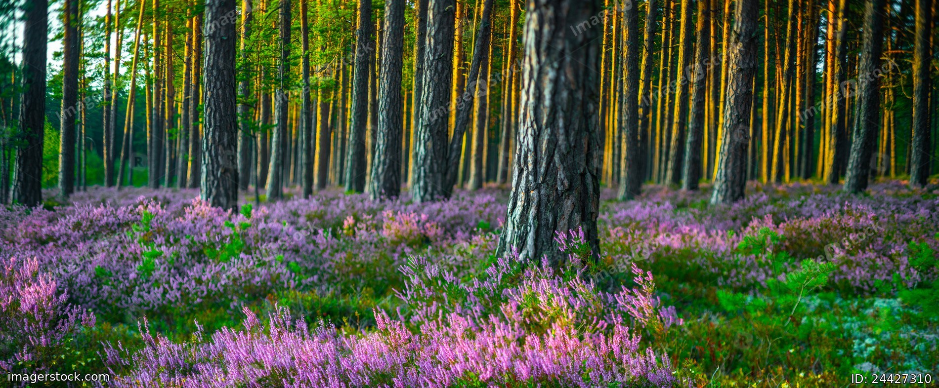 Sunny day. Blooming heather. Beautiful lawn in the forest.