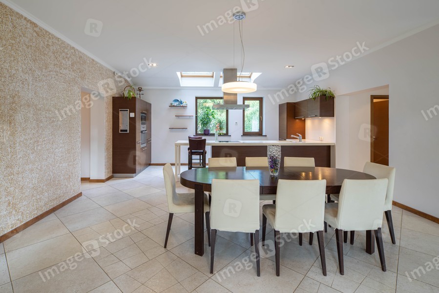 Modern interior of spacious luxury studio apartment. Wooden table and chairs. Kitchen set. White walls and tile floor.