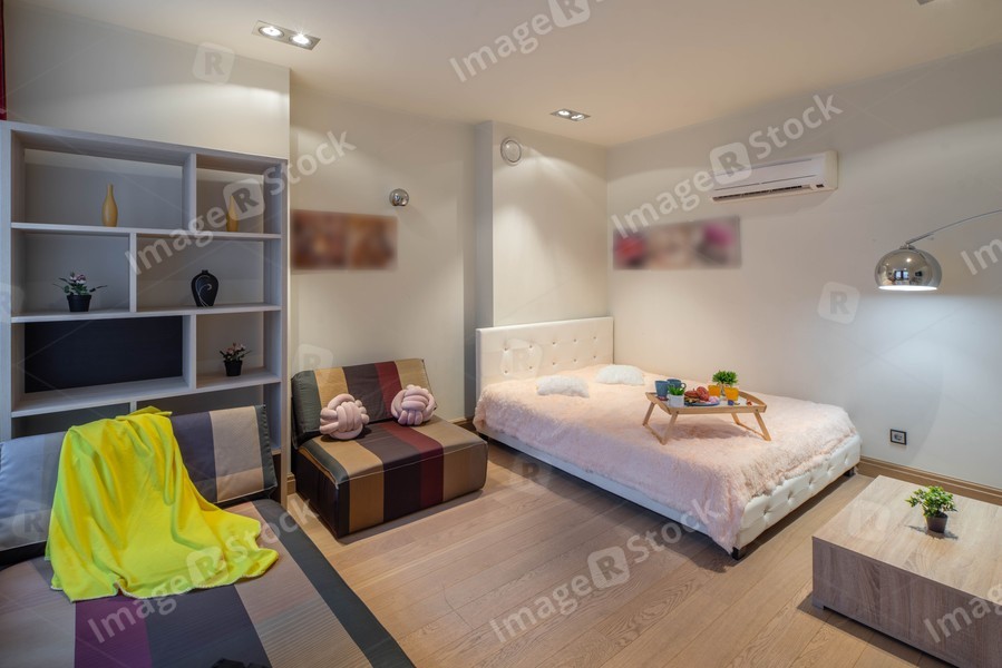 Interior of modern studio apartment. Bedroom with furniture.