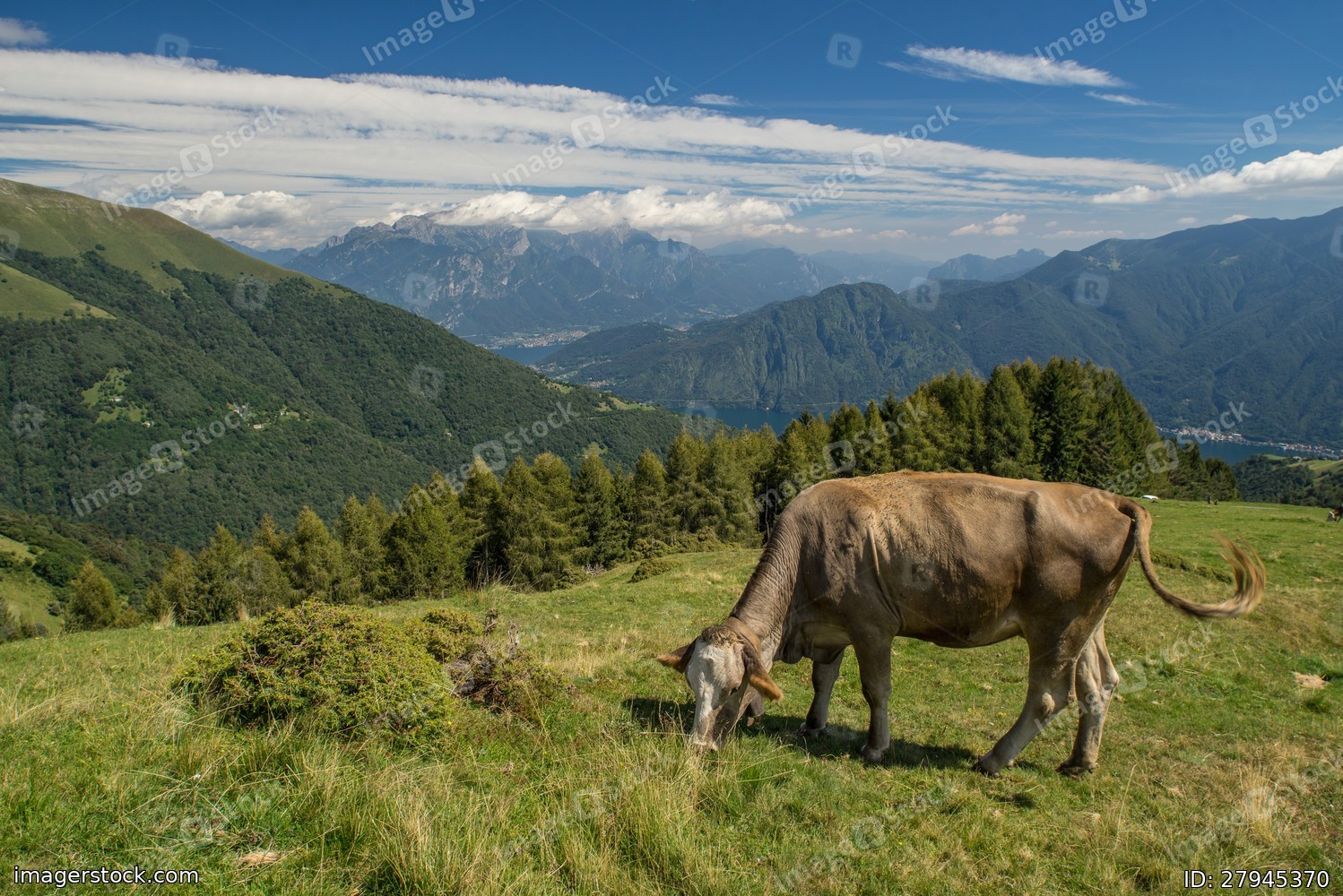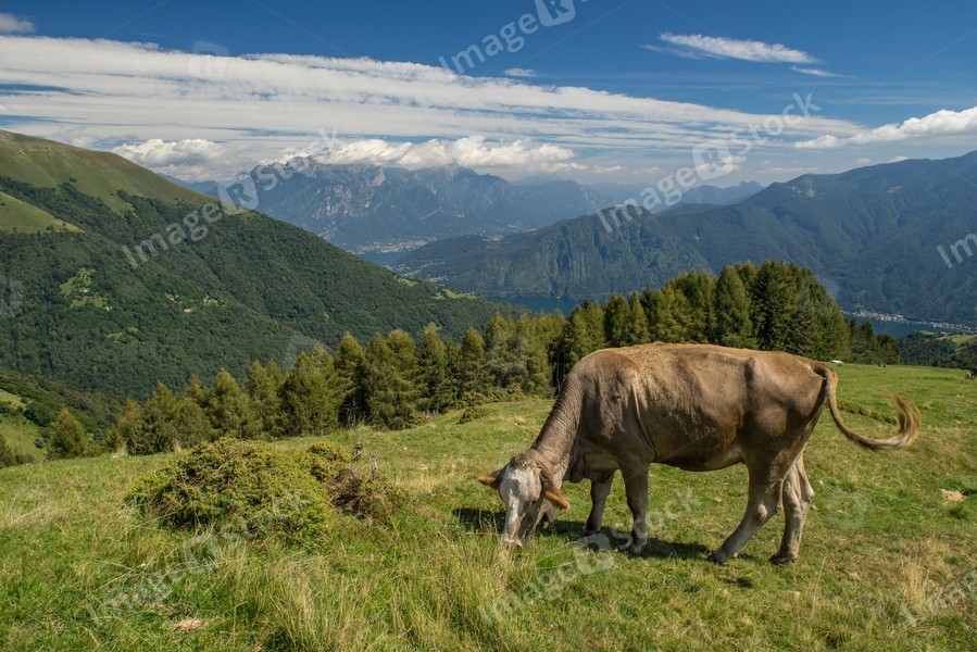 The pasture in the mountains. Cows grazing on the hills. Italy.