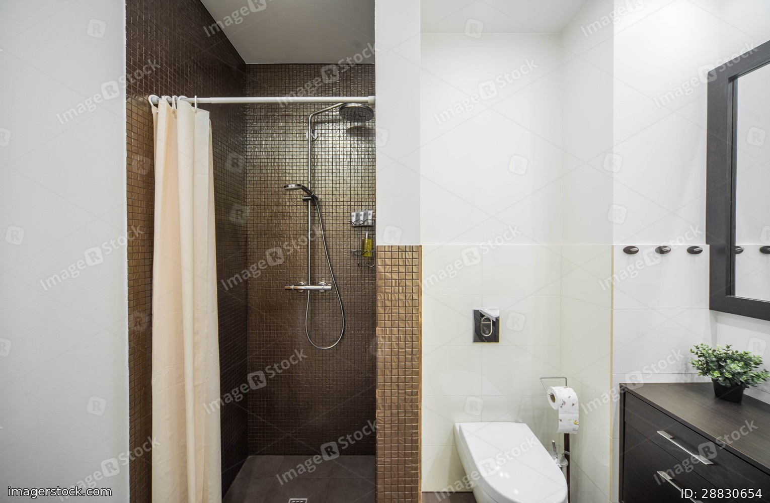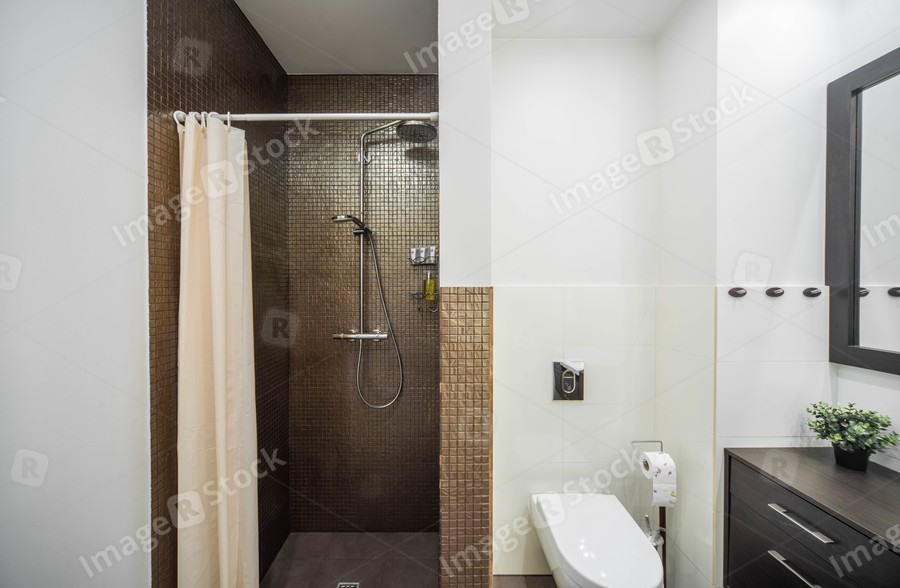 Modern interior of bathroom in shades of brown. Tiled floor.