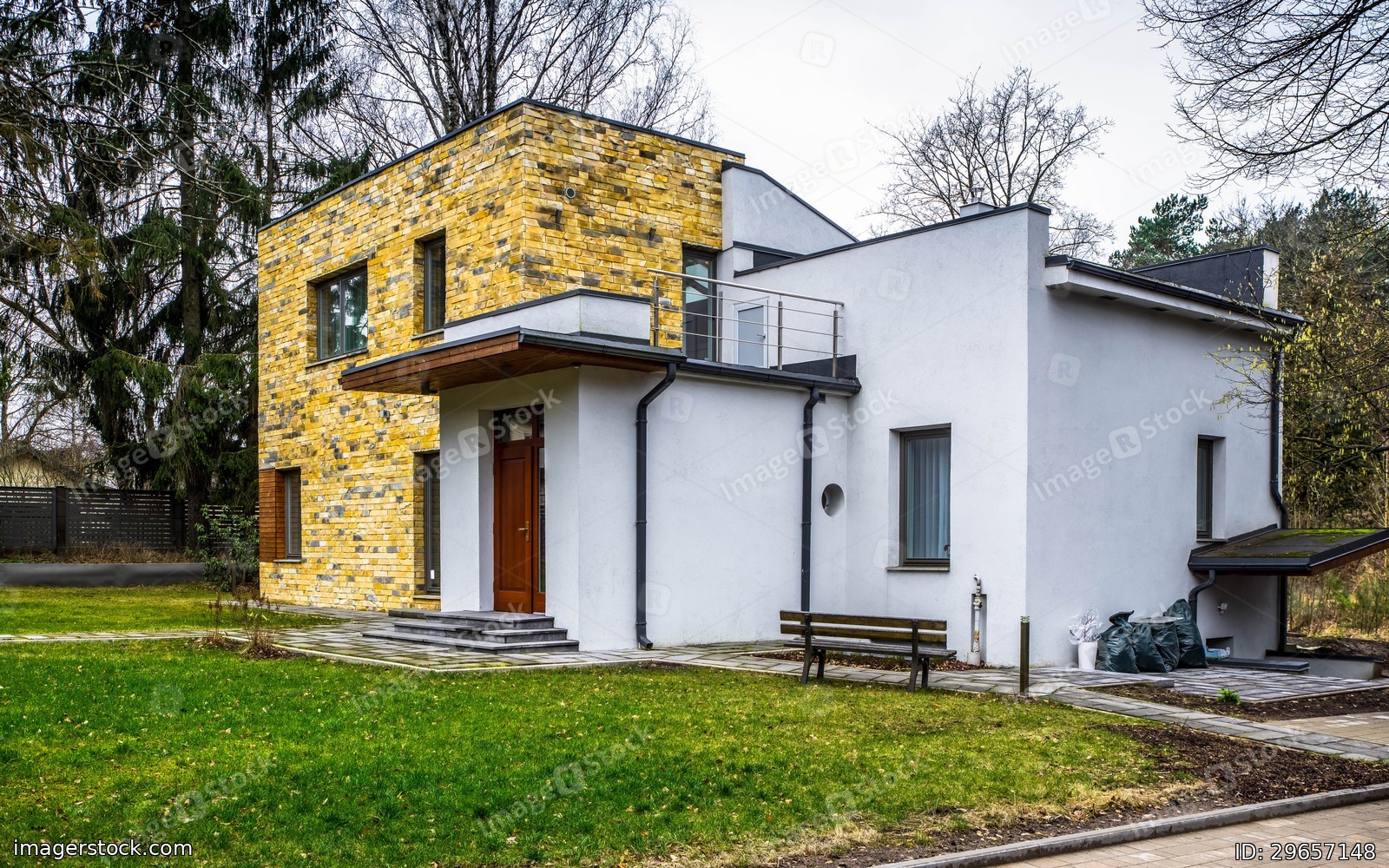 Modern design of facade of private house. An exterior of two-storey building. Autumn day.