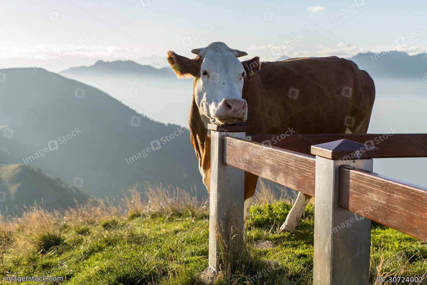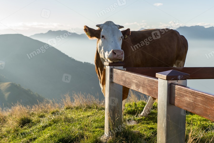 The pasture in the mountains. Cows grazing on the hills. Italy.