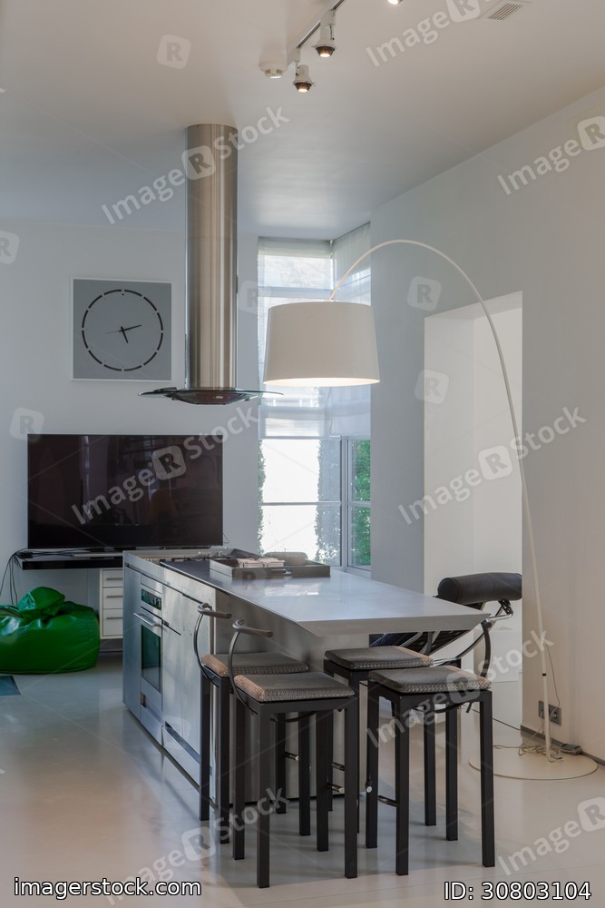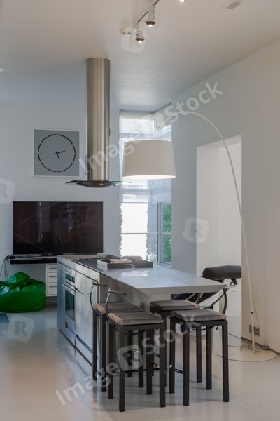 Modern white interior of spacious private house. Kitchen dinner room.