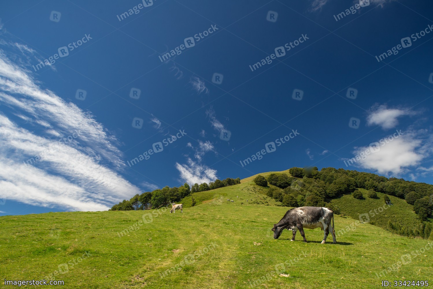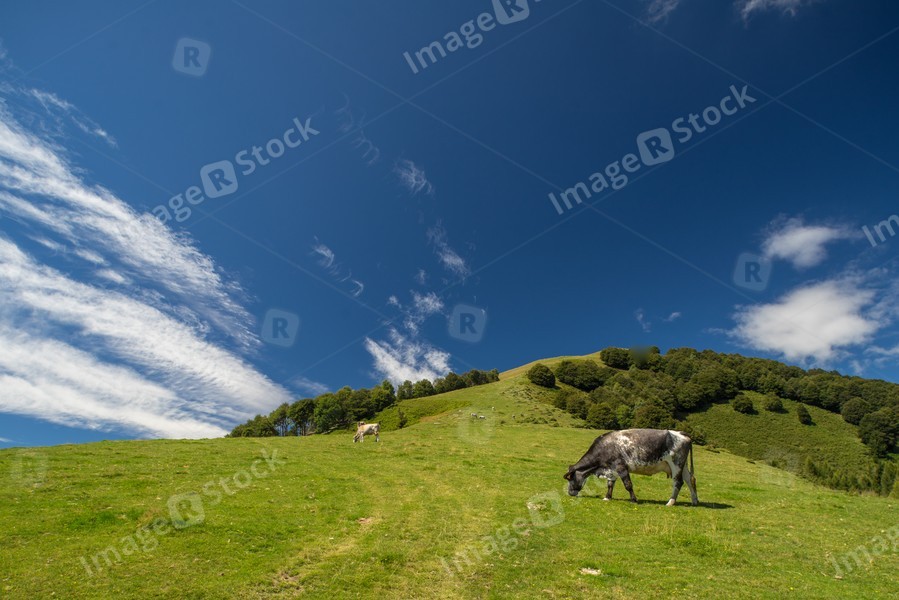 The pasture in the mountains. Cows grazing on the hills. Italy.