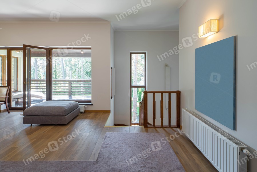 Light contemporary interior of private house. Cozy soft sofa. Glass door to terrace. Wooden staircase down.