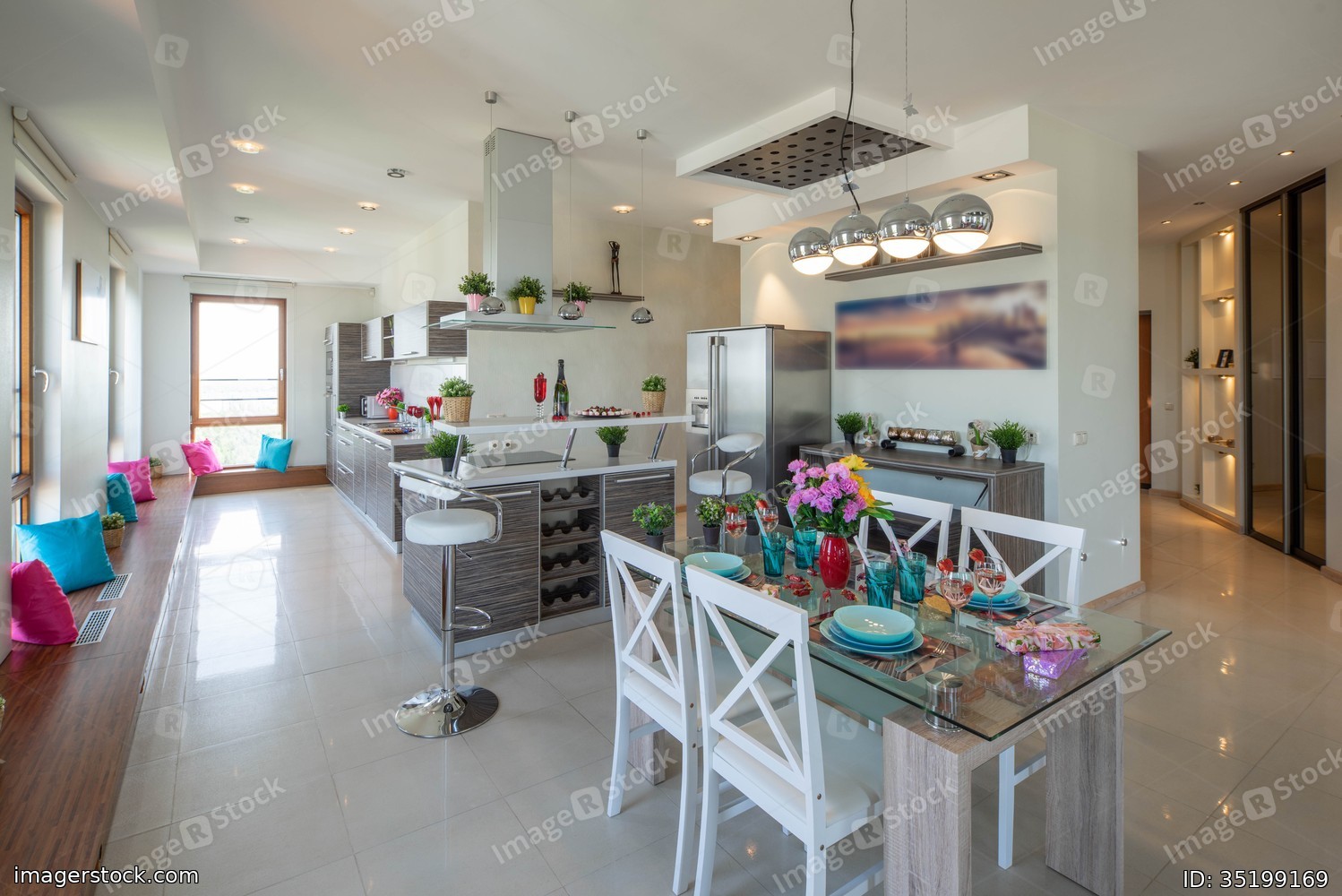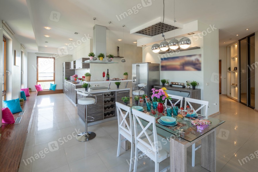 Interior of kitchen in modern studio apartment. Kitchen set and laid table. Luxury interior.