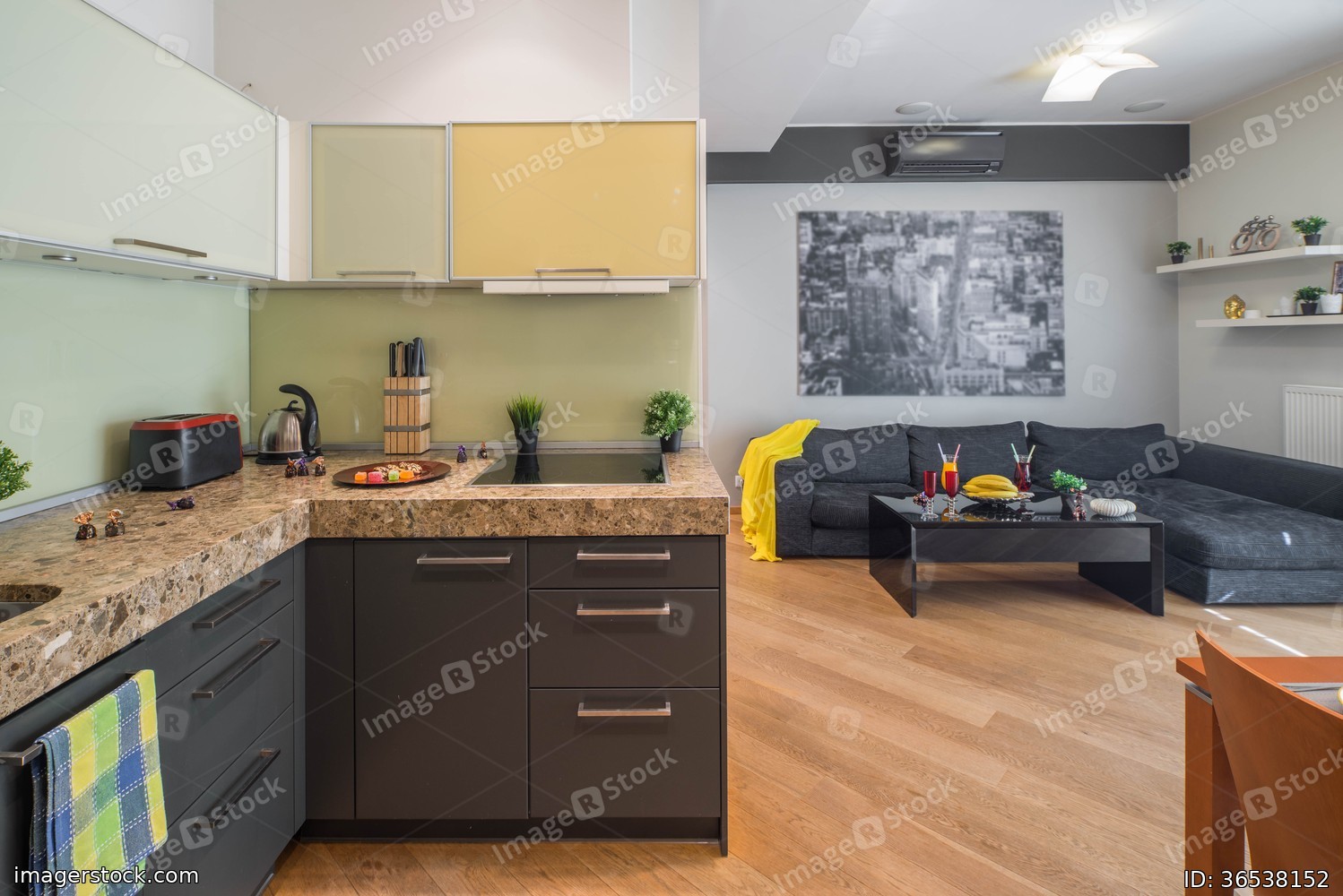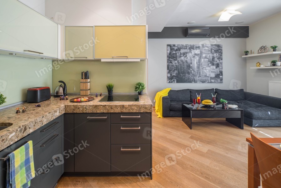 Interior of modern flat. Kitchen set. Small table. Cozy couch.