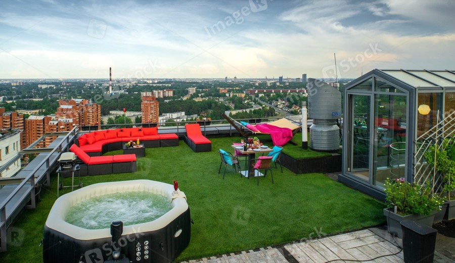 Relaxing zone on the rooftop with furniture and hot tub. Veiw of city from the top.