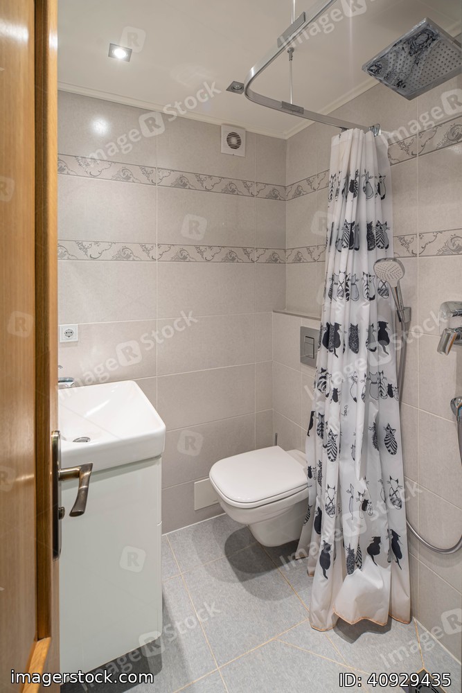 Contemporary interior of bathroom with toilet in private house. Shower curtain.