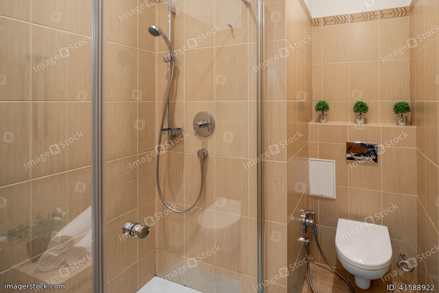 Modern interior of bathroom in warm brown tones. Shower cabin and toilet.