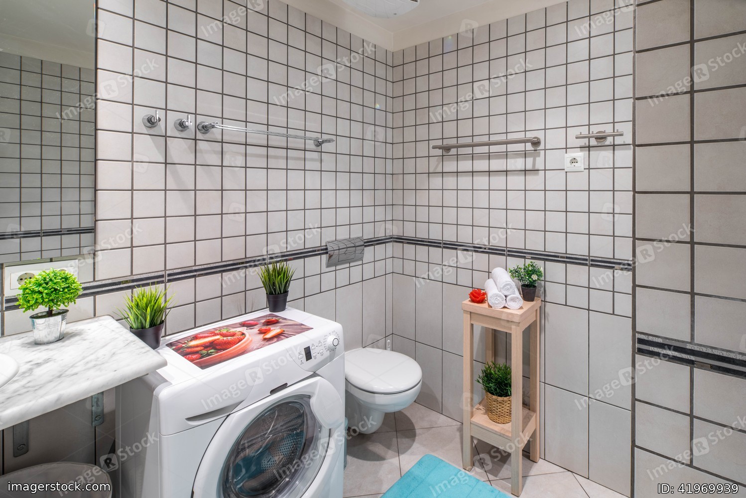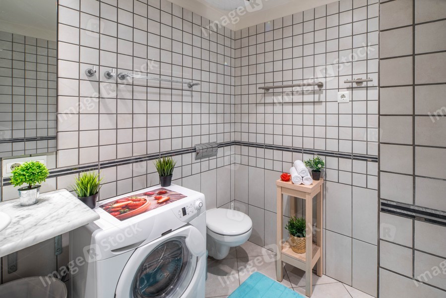Interior of bathroom with grey tile on the walls and floor. Washing machine.