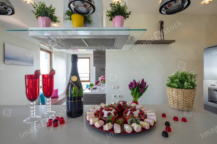 Delicious dessert. Strawberries and marshmallow. Bottle of champagne and couple of glasses.
