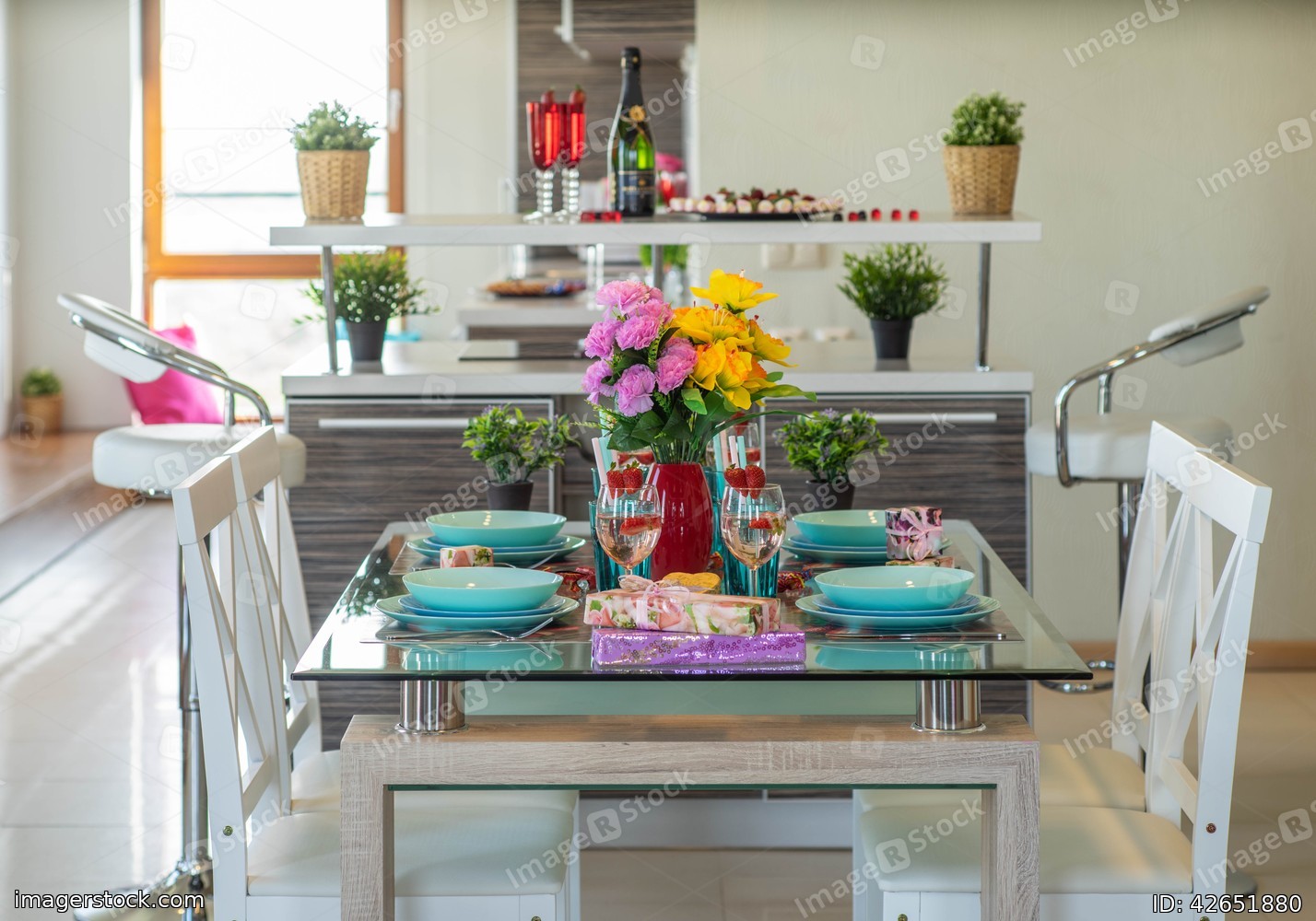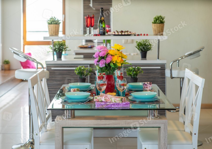 Close-up of laid table in modern studio apartment. Vase with flowers.