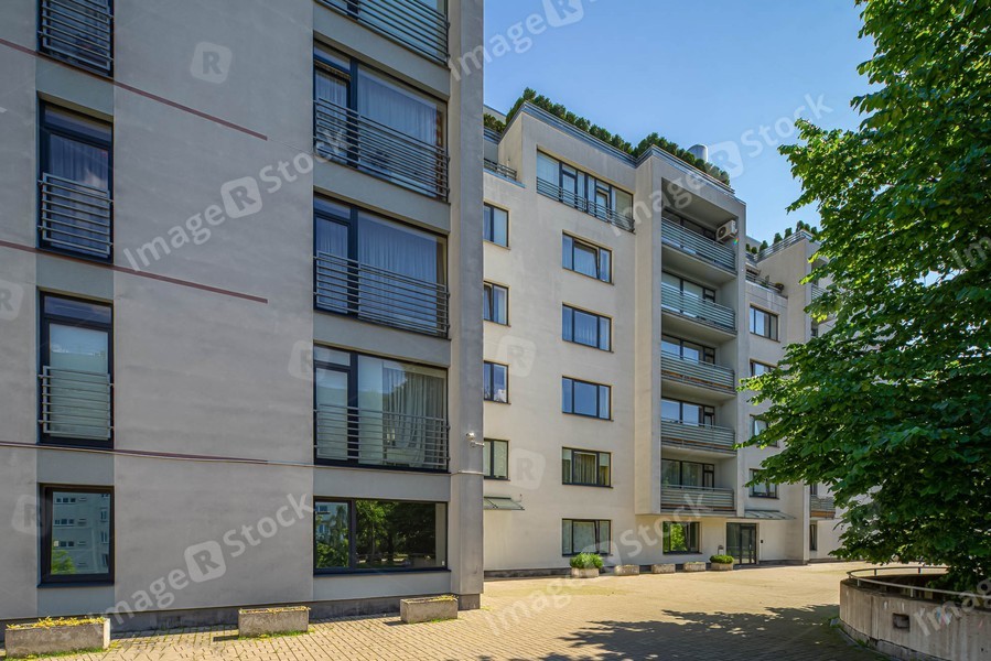 An exterior of buildings in modern living complex. Urban architecture at sunny summer day. Green tree.