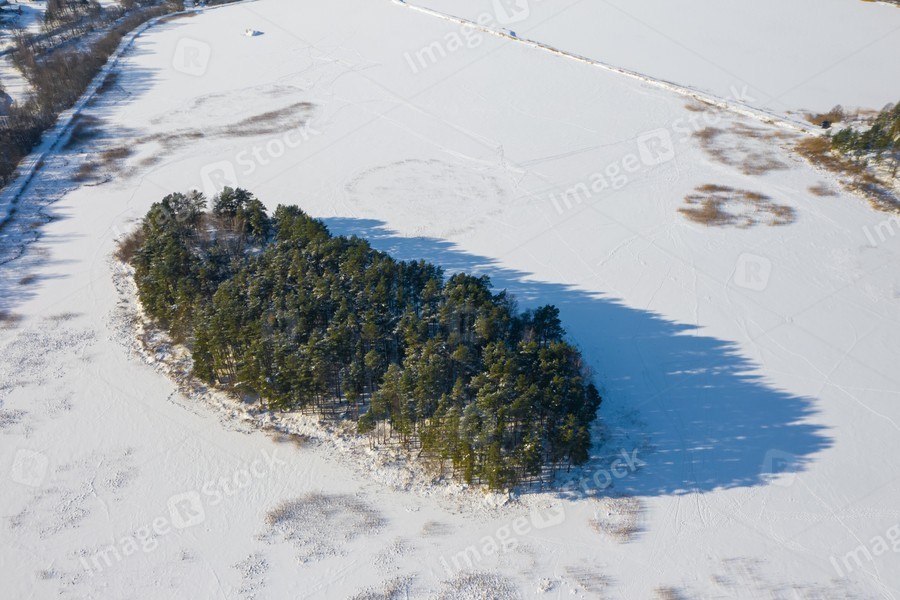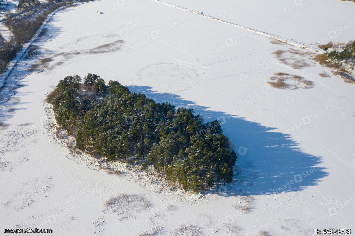 Top view of green trees and blue shadow on snow. Winter landscape.