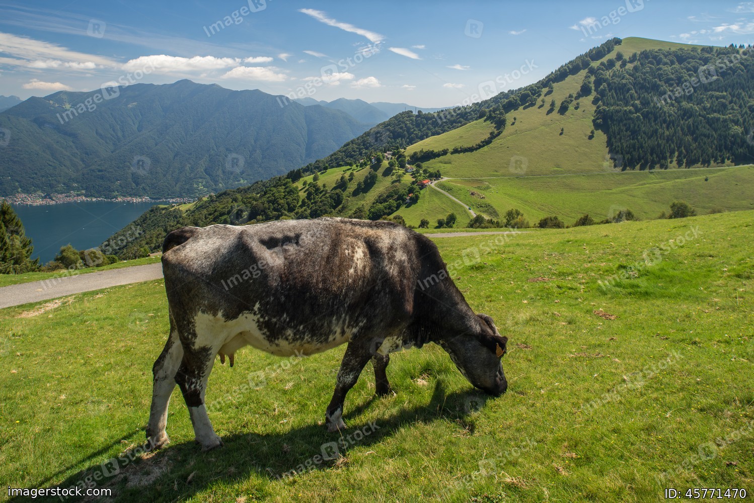 The pasture in the mountains. Cows grazing on the hills. Italy.
