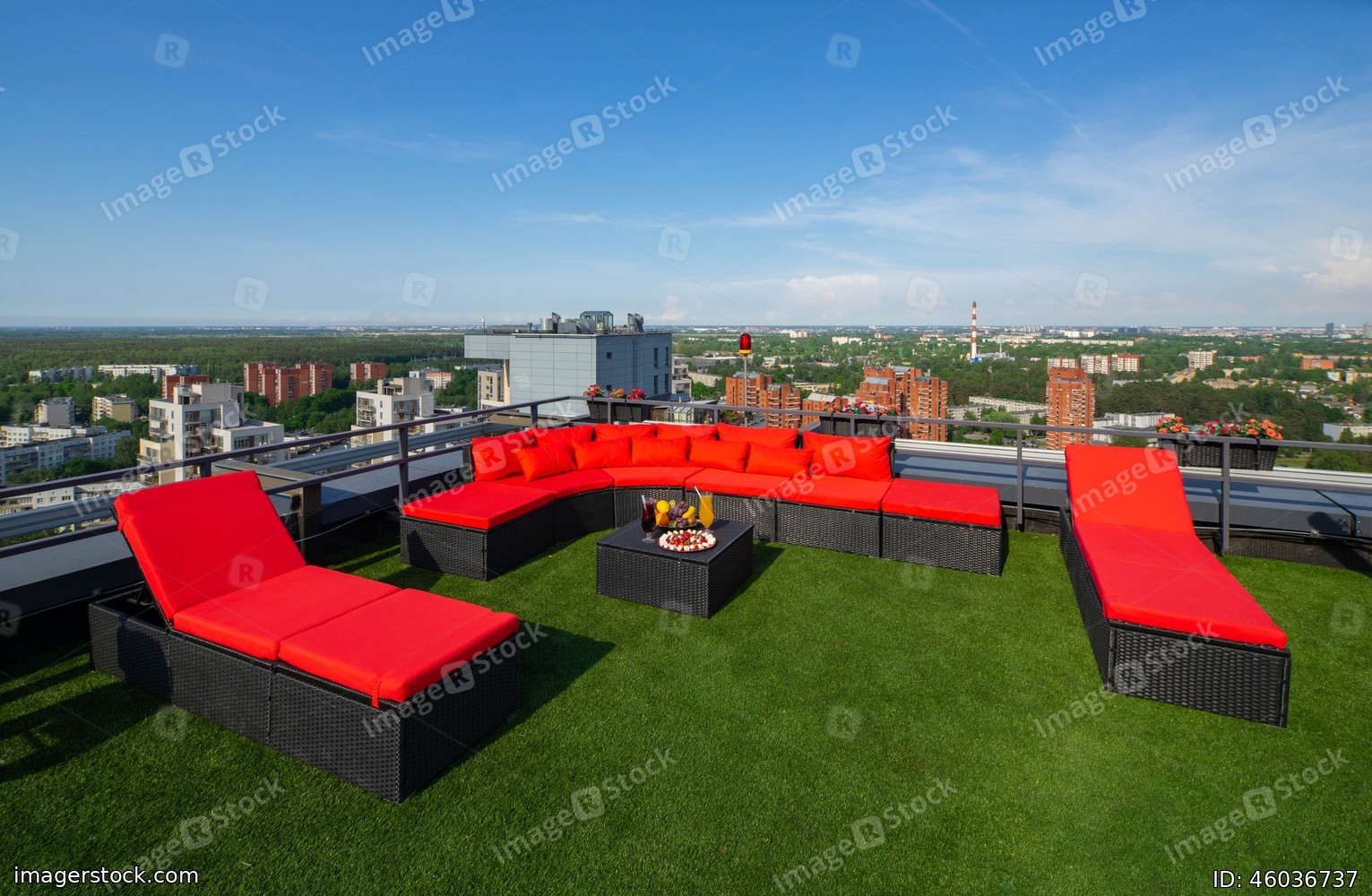 View of city from the top. Relaxing zone on the rooftop terrace.