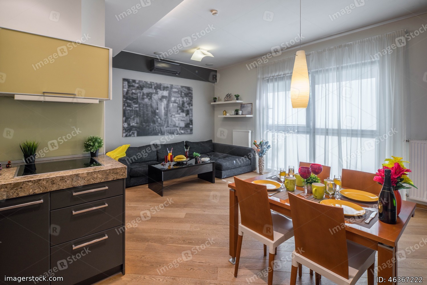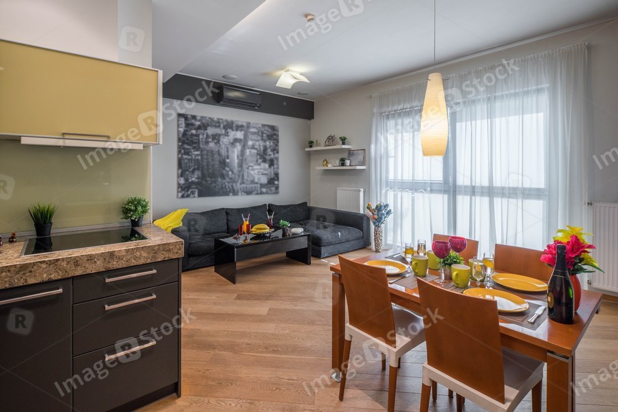 Interior of modern flat. Kitchen set. Table and chairs. Cozy couch.