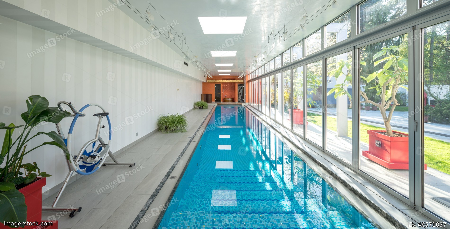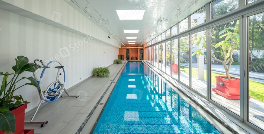Modern interior of luxury private house. Swimming pull in cottage.